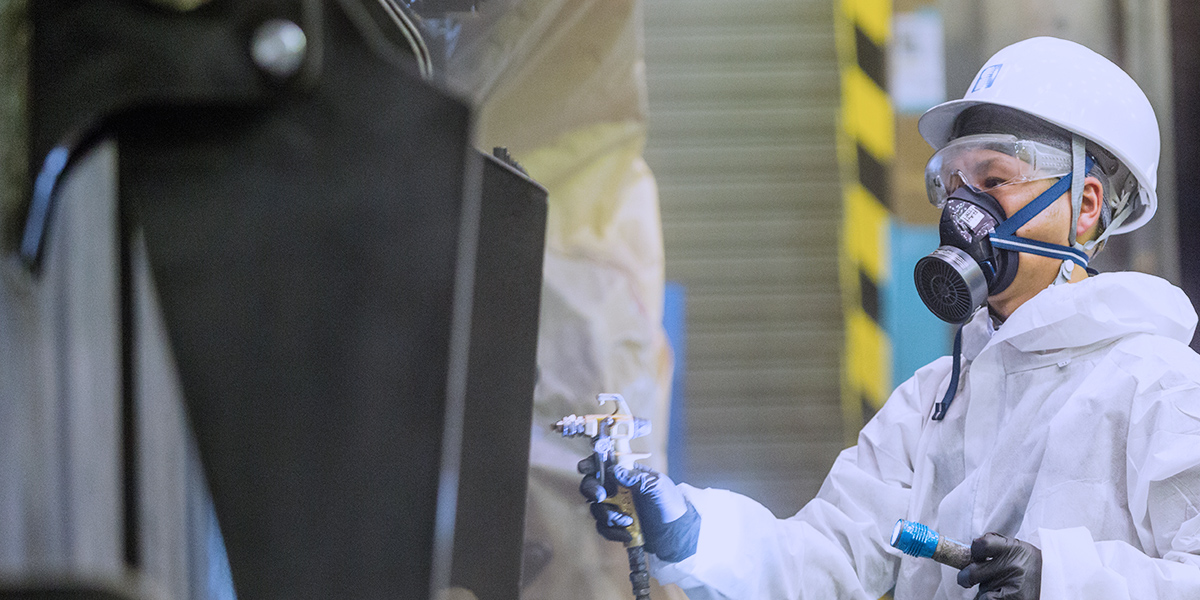 私はクローラクレーンの本体塗装を担当しています。大きなクレーンを5~6名のチームで協力しながら、3~4日かけて塗装する工程です。塗料をスプレー状に吹きつけるエアレス塗装機で全体を塗り、それが届かないような狭い場所には刷毛を使って手作業で丁寧に塗っていきます。表面にムラができるなど失敗した場合は、塗料を乾かせてサンドペーパーで削り取って塗り直します。塗装と聞くと誰がどう塗っても同じだと思うかもしれませんが、ベテラン技術者の作業スピードと塗りの品質は本当にすごいです。先輩たちの仕事を見て学び、塗り方やコツを自分なりに工夫できるのが楽しいです。キレイに素早く塗れると、大きなやりがいを感じますね。